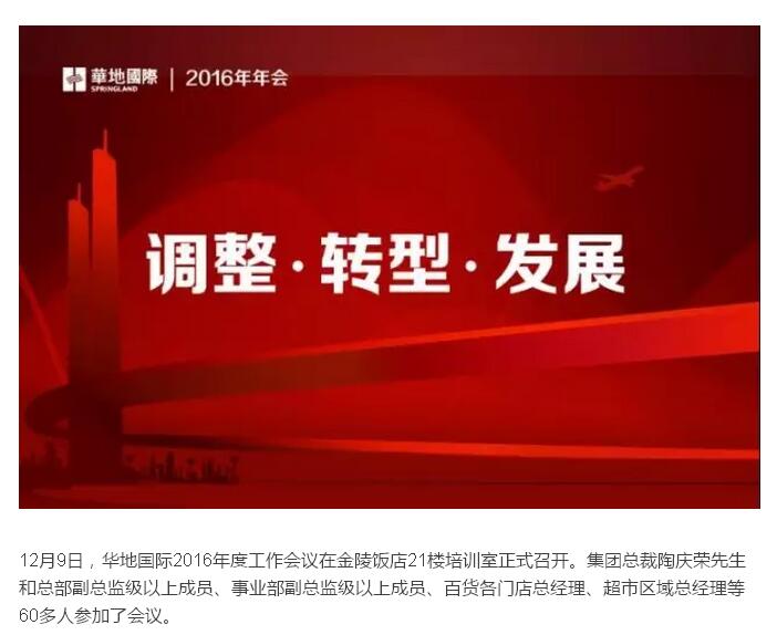 2015年12月16日,華地國際百貨事業(yè)部2016年度工作會議在金陵飯店21樓培訓室召開。集團總裁陶慶榮先生,集團副總裁、百貨事業(yè)部總經(jīng)理徐志強先生及事業(yè)部各部門高級經(jīng)理以上人員、門店總助級以上人員參加了會議,各門店經(jīng)理級人員通過視頻會議以分會場形式列席了會議。徐志強發(fā)表講話徐總圍繞“轉型與效率”兩方...